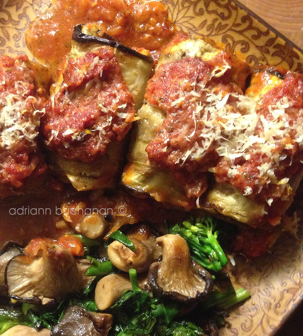 Ah, writing about food again. Rusty? Maybe. But, when you have a passion about something, it’s hard to keep it suppressed for very long. Sometimes life transforms into a shit show and can divert you from things you care about. The point is, when coming out on the other side of things, to try and regain those bits and pieces that got jettisoned in the process of just trying to get through each day. Cooking for absolute pleasure never left me, thankfully, and sometimes it was therapy in and of itself. I have left some people completely dumfounded when I talk about cooking being one of the most zen things I do. People that don’t get it are in a class that leaves me shaking my head. It’s hard for me to believe, but I try and remind myself of a strange fact: Some people just can’t cook. I am grateful that for me, it’s pure joy. So let me try and revisit that habit that documents the things I cook, eat, and all that good stuff and try and share a little bit of happiness, enthusiasm, and complete geekiness. Non-food related side note. After many hours of extremely frustrated pissed off angst, I am trying to resign myself to the fact that I am permanently locked out of my previous blog: www.mytastyplanet.blogspot.com. Recovery is simply not an option, so starting over is something I am ‘trying’ to digest. If you would like to read older content, please visit it and take a gander. Now for dinner… Since it is the month of January, I am doing my annual detox for the month. No sugar, no wheat, no dairy, and (gasp) no alcohol. This year I have decided to take a more paleo route, so meat and eggs have been included, where as legumes are out. People always ask me what in the hell I eat during the month when I give them the list of no-nos. They assume I subsist on heads of lettuce I guess. For me, constraints are always a catalyst for creativity. I guess I COULD live on carrot sticks and chicken breasts, but who the fuck would want to? I don’t think I have made the exact same meal twice for dinner this month. I will try and put a good many online, but I will start with my eggplant rollatini (basically strips of eggplant that you can use in place of sheets of pasta). I traditionally do my rollatini with ricotta, but since dairy is taking a short vacay, I had to figure out a good filling that would hold together well and be both flavorful as well as satisfying. Using random tidbits from the refrigerator and some staple pantry items made this easy to put together. Prepping the eggplant is the most time consuming bit, but after that it really is very easy to make. I served mine with a side of mushrooms and greens - oyster mushrooms and guylan, because that’s what I had. A simple sauté in olive oil with salt and red pepper flakes kept them in line with the ‘Italian’ flavor profile of the rollatini. This is a process, so be prepared to futz with a few things before dinner is ready. Step 1: Prep eggplant. Use large firm eggplants. Trim the sides slightly to make give them a squarish shape. This will make it easier to cut uniform even ‘sheets’ (remember you are going to use these like sheets of pasta). Cut eggplant lengthwise into 1/4” slabs. Plan on 3-4 sheets to roll up per person. I used one big guy and got 11 good ‘sheets’ and some janky bits. Not every piece will be perfect, but sometimes you can piece a couple of odd ones together to make a whole. Heat up a skillet over a high flame and drizzle olive oil over eggplant pieces. Eggplants are sponges, so go easy on the olive oil and expect it to disappear into the flesh almost immediately. Sprinkle with salt and then cook each slice until each side gets blistered and the piece softens. Remove and stack on a plate to cool. Step 2: Prep tomato sauce. You can use your favorite jar of sauce, make some from scratch, or do what I did and doctor up a jar of sauce. I like Trader Joe’s Traditional Marinara as it doesn’t have any weird ingredients or added sugar. It’s a good starting point for a quick sauce. I add sautéed onions, garlic, and some Victoria Gourmet Tuscan spice blend (I love these products). Simple is good since this is just an accent to the rollatini. Preheat oven to 350º Step 3: Prep filling. I blended the non-raw-chicken items first so I could taste for seasoning. • 1 can of whole artichoke hearts (plain, not marinated - and use frozen if you have them, or hell - peel, steam and de-choke your own) • I used about 1/2 cup of leftover steamed cauliflower, but you can leave that out • 2 tablespoons of olive tapenade • 2 tablespoons of pesto (I had some leftover in the fridge) Add all ingredients to a food processor and pulse until chunky smooth. Add salt and pepper to taste. Remove to a mixing bowl. Cube up 2 boneless, skinless chicken breasts, add to food processor with one whole egg and pulse until smooth. Add to artichoke mixture and combine. Step 4: Stuff eggplant pieces. In the bottom of a shallow baking dish spoon some of the tomato sauce so that there is a bed for the eggplant rolls to rest on. Lay each piece of eggplant flat and using your hands scoop and spread a layer of the chicken filling over the entire surface of the eggplant - a little more than 1/4”. Start at one end and gently roll up the eggplant from one end to the other. Not tightly, or your filling will squish out. Place seam side down on top of tomato sauce. Repeat with all pieces and finally spooning a bit more of the sauce over each one. Note: Yes, I cheated a LITTLE and put a tiny bit of pecorino romano over the top before putting it into the oven. Bake for about an hour. Serve with a salad, or another tasty veggie side like the greens and mushrooms I did - just something simple. I was really pleased with how this turned out. Basically any type of filling you might use in a ravioli should work here, so it does lend itself to experimentation. Have fun and enjoy. Cheers, Adriann